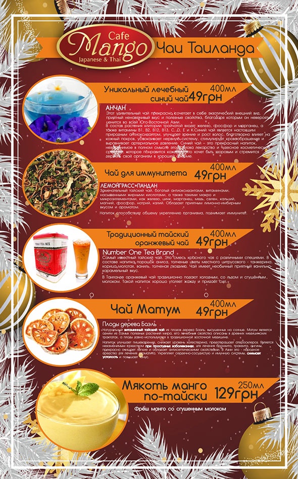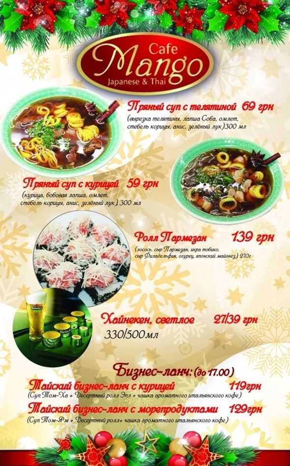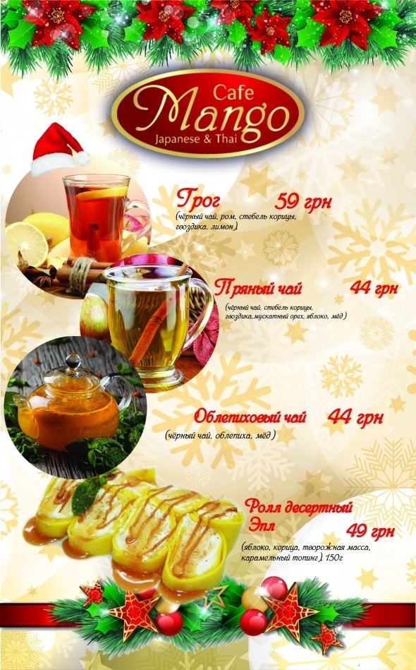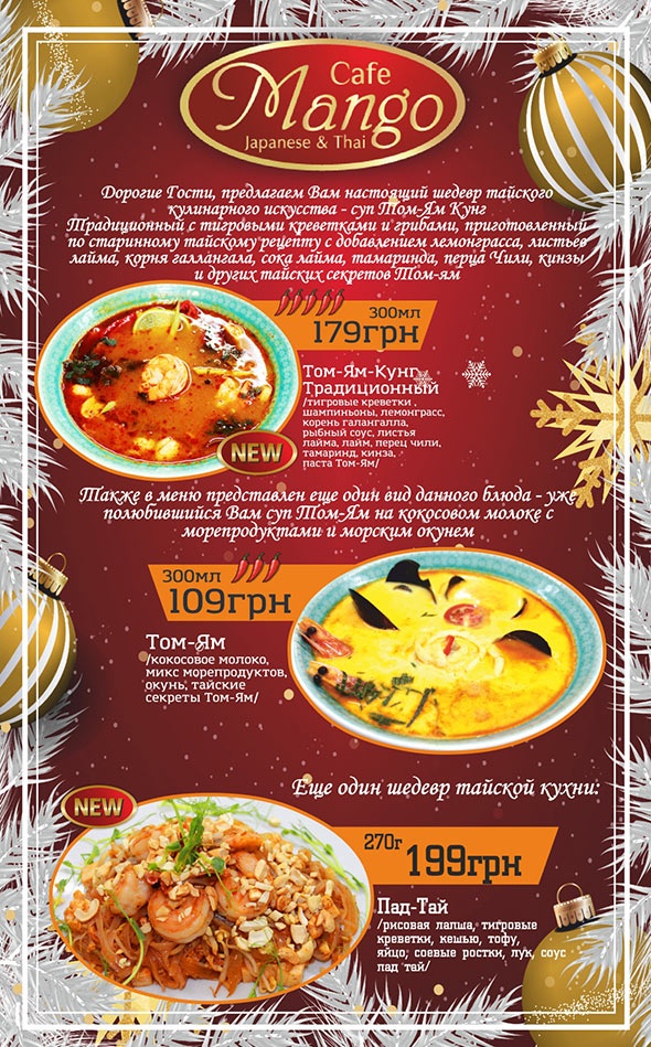 Кафе «Манго» – это сочетание экзотики Востока, роскоши и изыска кулинарных шедевров японской и тайской кухни, пикантность которой придаёт король тропиков – МАНГО.